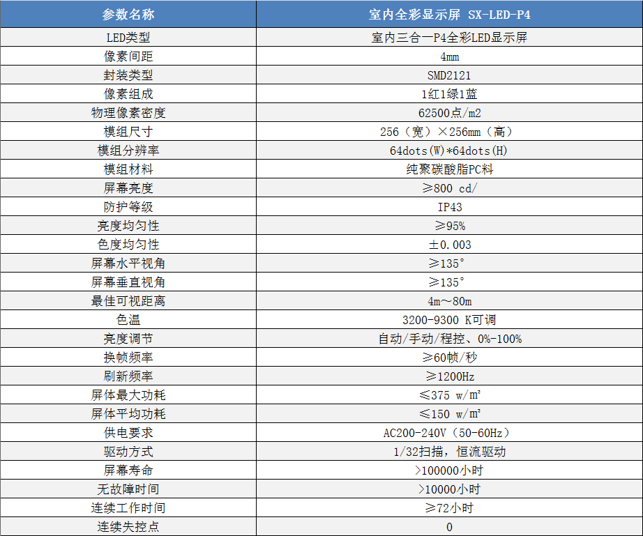 P4室內(nèi)小間距高清全彩LED顯示屏技術(shù)參數(shù):