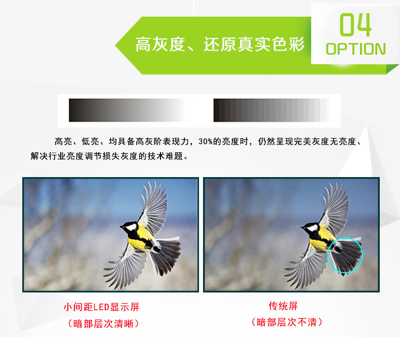 1、P1.562全彩顯示屏采用四燈合一HD LED封裝技術(集成SMD+COB優點),該技術解決墨色一致性、拼接縫、漏光、維修等問題,同時具備高對比度、高集成、易維護、耐撞擊、防串光等特點。